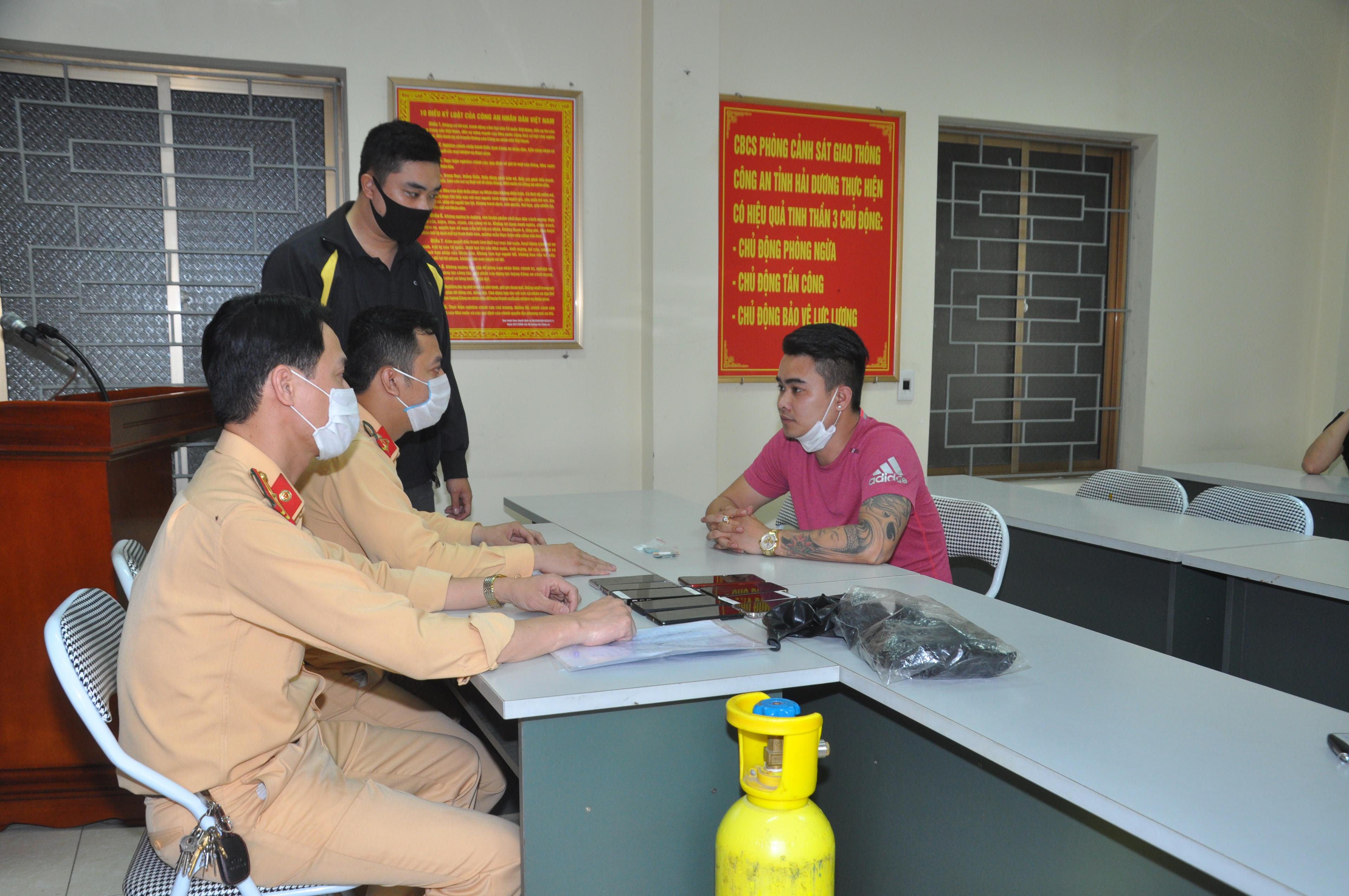 Tiếp tục kiểm tra, tổ công tác của Phòng CSGT phát hiện trên xe có 1 bình nén khí NO2 (loại dùng bơm hơi cho bóng cười), 01 túi ni lông bên trong chứa 36 quả bóng cười màu đen, một số bóng cười đã qua sử dụng.
