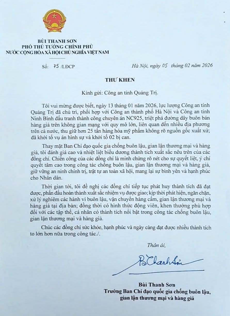 (PLVN) - Phó Thủ tướng Chính phủ, Trưởng Ban Chỉ đạo quốc gia chống buôn lậu, gian lận thương mại và hàng giả Bùi Thanh Sơn vừa gửi Thư khen, biểu dương Công an tỉnh Quảng Trị vì triệt phá thành công đường dây buôn bán hàng giả quy mô lớn trên không gian mạng, thu giữ hơn 25 tấn mỹ phẩm không rõ nguồn gốc.
