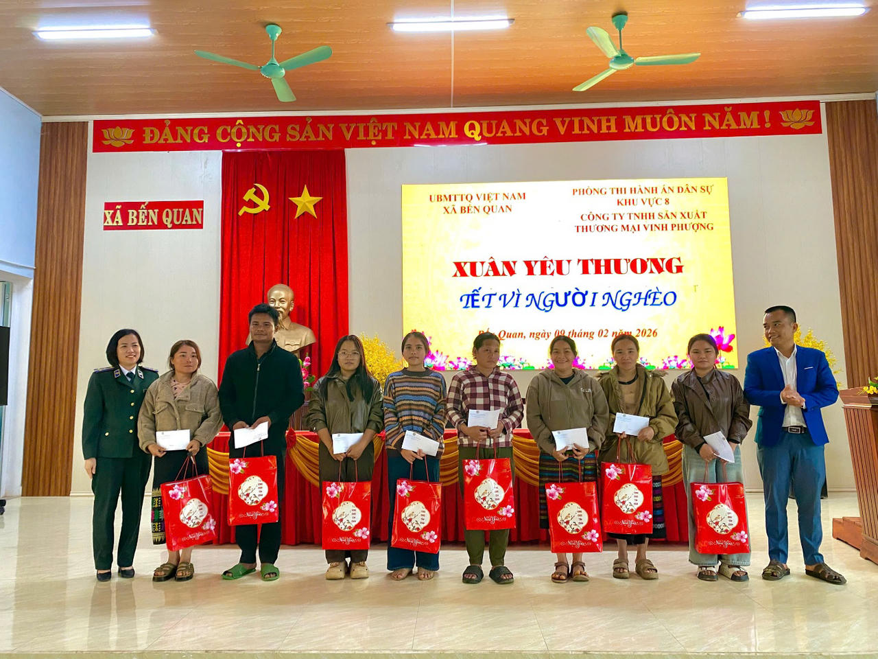 Chiều 9/2, Phòng Thi hành án dân sự khu vực 8 (tỉnh Quảng Trị) phối hợp với Công ty TNHH Sản xuất Thương mại Vinh Phượng (tỉnh Bình Phước) tổ chức chương trình “Xuân chia sẻ – Tết yêu thương", trao quà mừng năm mới Bính Ngọ 2026 cho các hộ gia đình có hoàn cảnh khó khăn trên địa bàn xã Bến Quan (Quảng Trị).