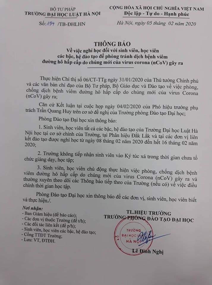 Phòng tránh Corona, Đại Học Luật Hà Nội cho học viên, sinh viên nghỉ đến 16/02.