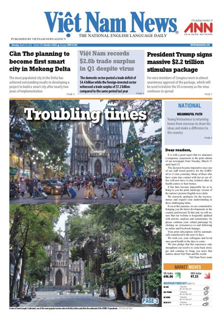 Trong thư gửi độc giả đăng trên số báo ra ngày 30/3, Ban Biên tập Việt Nam News cho biết quyết định tạm dừng (báo in) này rất quan trọng khi một trong các phóng viên của Báo có kết quả dương tính với virus corona chủng mới (SARS-CoV-2) hôm 29/3.