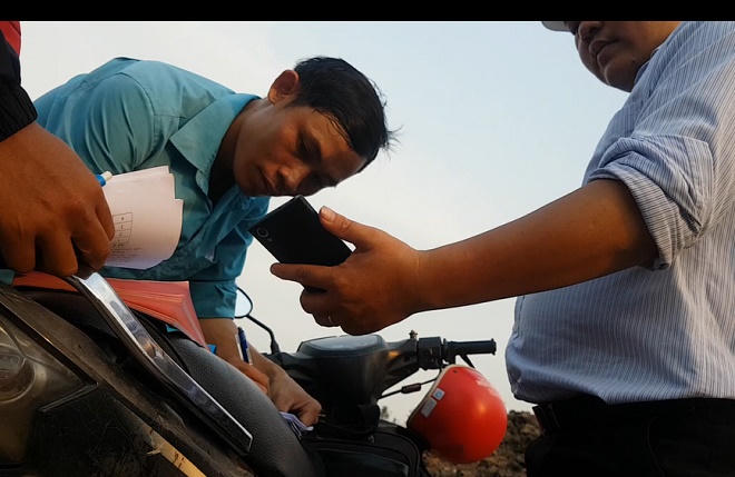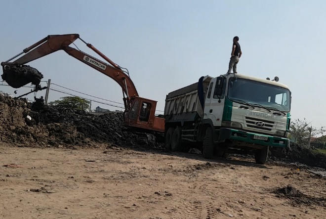 Tại đây, tài xế tiếp tục lấy bùn bôi vào số xe ở hai thành xe ben, để che lấp số xe đã sơn ở hai thành của xe ben này. Lúc này, PV thấy hai người đàn ông chạy xe Honda đến, leo lên thùng xe lấy thước đo thùng xe, có lẽ để tính khối lượng. Đo xong, người đàn ông nhảy xuống xe, xe cuốc bắt đầu cuốc những gầu bùn thải đổ vào thùng xe.