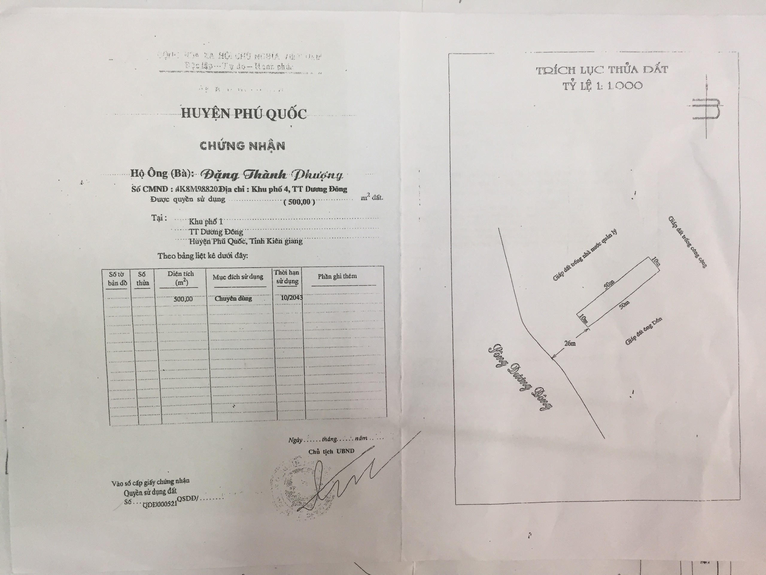 Qua xác minh của phóng viên, tại GCNQSDĐ đứng tên ông Đặng Thành Phượng, chồng bà Nhung cấp ngày 30/09/2004 thể hiện, phần diện tích được cấp có diện tích 500m2, loại đất chuyên dùng.