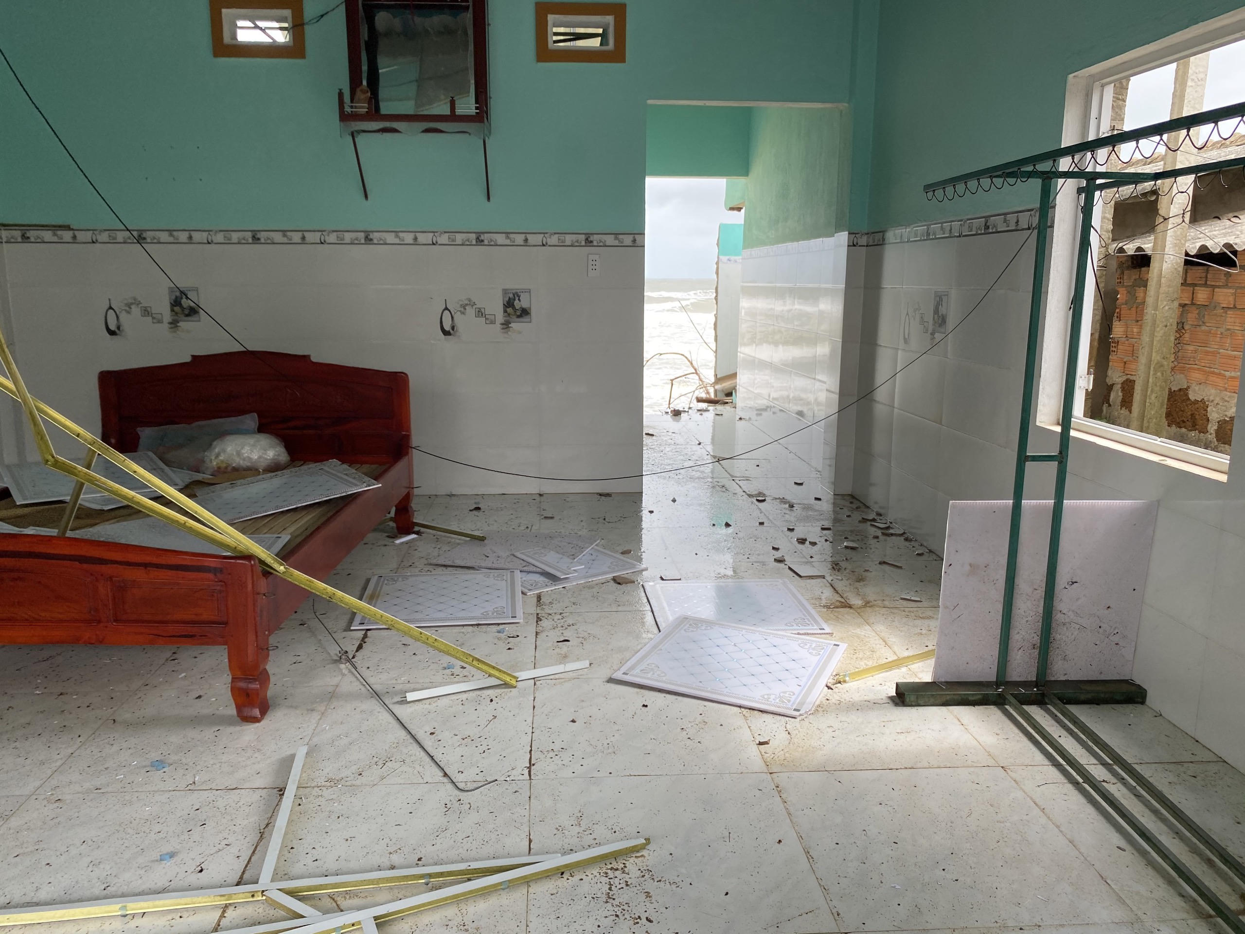 Những ngày qua, bà Huỳnh Thị Tuyết (thôn Phước Thiện, xã Bình Hải) phải chạy đôn chạy đáo mua tấm bạt phủ vào vị trí móng nhà sạt lở. Thế nhưng, hơn 2/3 ngôi nhà bị sóng đánh sập, bà Tuyết nói như khóc: “Tôi làm như vậy vừa để ngăn nước mưa từ trên đồi chảy xuống, vừa giảm thiểu tác động của sóng biển. Bao nhiêu năm tích góp mới xây được ngôi nhà, giờ biển đã “nuốt sạch”.