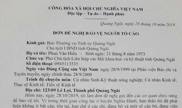 Ngày 27-11, Tiến sĩ Phan Văn Hiếu, Phó Chủ tịch Liên hiệp các Hội Khoa học và Kỹ thuật tỉnh Quảng Ngãi, Nguyên Phó Bí thư huyện Nghĩa Hành cho biết vừa gửi đơn đến các ngành chức năng của tỉnh Quảng Ngãi để đề nghị bảo vệ tính mạng cho bản thân và gia đình.