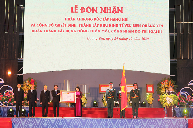 (PLVN) - Tối 24/12, tại TX Quảng Yên đã diễn ra buổi Lễ đặc biệt với 04 sự kiện quan trọng được diễn ra: Lễ đón nhận Huân chương Độc lập hạng Nhì và công bố Quyết định thành lập Khu kinh tế (KKT) ven biển Quảng Yên; công nhận TX Quảng Yên hoàn thành xây dựng nông thôn mới (NTM); công nhận TX Quảng Yên là đô thị loại III.