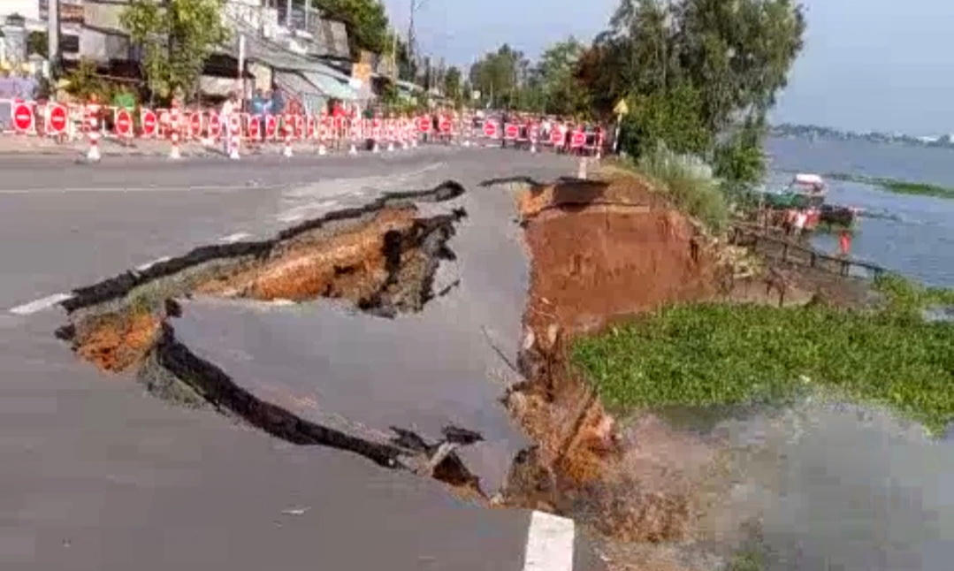 Một mảng đường lớn đã sụp xuống dòng sông Hậu. Đoạn sạt lở dài khoảng 40 mét, ăn sâu vào khoảng 1/2 mặt đường QL91.