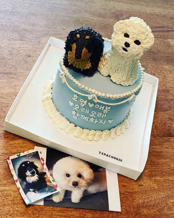 Hình ảnh hai chú cún cưng trên bánh sinh nhật cũng như cách đặt tên chú chó Hoyoung được ghép từ “Ho” (tên nam diễn viên) và “Young” (tên của Sooyoung) đã chứng minh anh trân quý tình cảm của mình với bạn gái như thế nào.