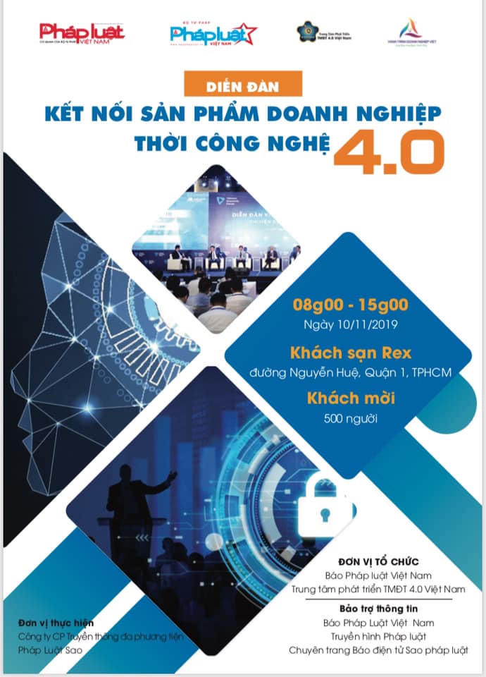 (PLVN) - Ngày 10/11 tới đây, tại Khách sạn Rex, TP Hồ Chí Minh, Công ty CP Truyền thông đa phương tiện Pháp Luật Sao và Trung tâm phát triển thương mại điện tử 4.0 Việt Nam tổ chức diễn đàn “Kết nối sản phẩm và doanh nghiệp thời công nghệ 4.0” với sự tham gia của các diễn giả, chuyên gia hàng đầu và đội ngũ doanh nghiệp. Diễn đàn được sự bảo trợ truyền thông của Báo Pháp luật Việt Nam, Truyền hình Pháp luật và Chuyên trang Báo điện tử Sao Pháp luật.