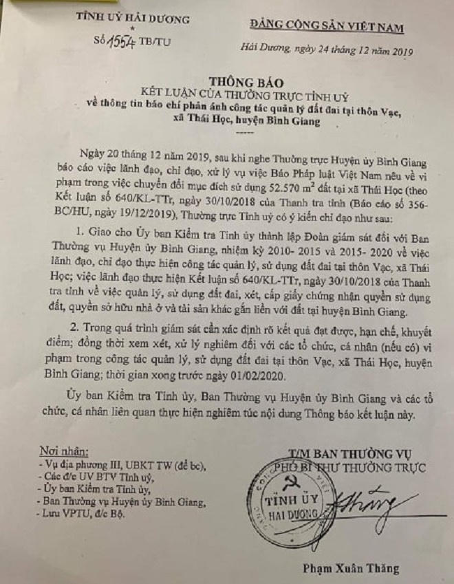 Sau khi PLVN đăng tải loạt bài, ngày 24/12/2019, Tỉnh ủy Hải Dương đã có Văn bản số 1554-TB/TU, do Phó Bí thư Thường trực Phạm Xuân Thăng ký, thông báo kết luận của Thường trực Tỉnh ủy: 1. Giao UBKT Tỉnh ủy thành lập Đoàn giám sát với Ban Thường vụ Huyện ủy Bình Giang, nhiệm kỳ 2010 – 2015 và 2015 – 2020 về việc lãnh đạo, chỉ đạo thực hiện công tác quản lí, sử dụng đất đai tại thôn Vạc, xã Thái Học; 2. Xem xét, xử lí nghiêm với tổ chức, cá nhân vi phạm trong quản lí, sử dụng đất đai tại thôn Vạc, xã Thái Học. Những nội dung này phải thực hiện xong trước ngày 1/2/2020. Văn bản này được gửi đến Ủy ban kiểm tra (UBKT) Trung ương, các Ủy viên Ban Thường vụ Tỉnh ủy Hải Dương, UBKT Tỉnh ủy.