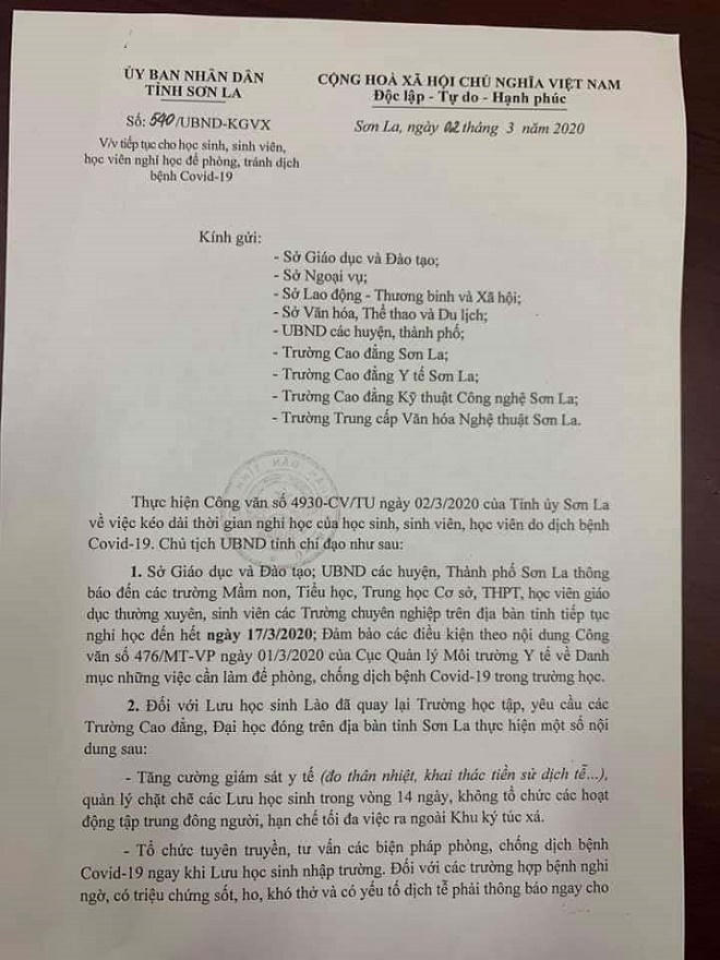Tuy nhiên, tối cùng ngày, UBND tỉnh Sơn La có thông báo về việc tiếp tục cho học sinh, sinh viên, học viên nghỉ học để phòng, tránh dịch bệnh Covid-19.