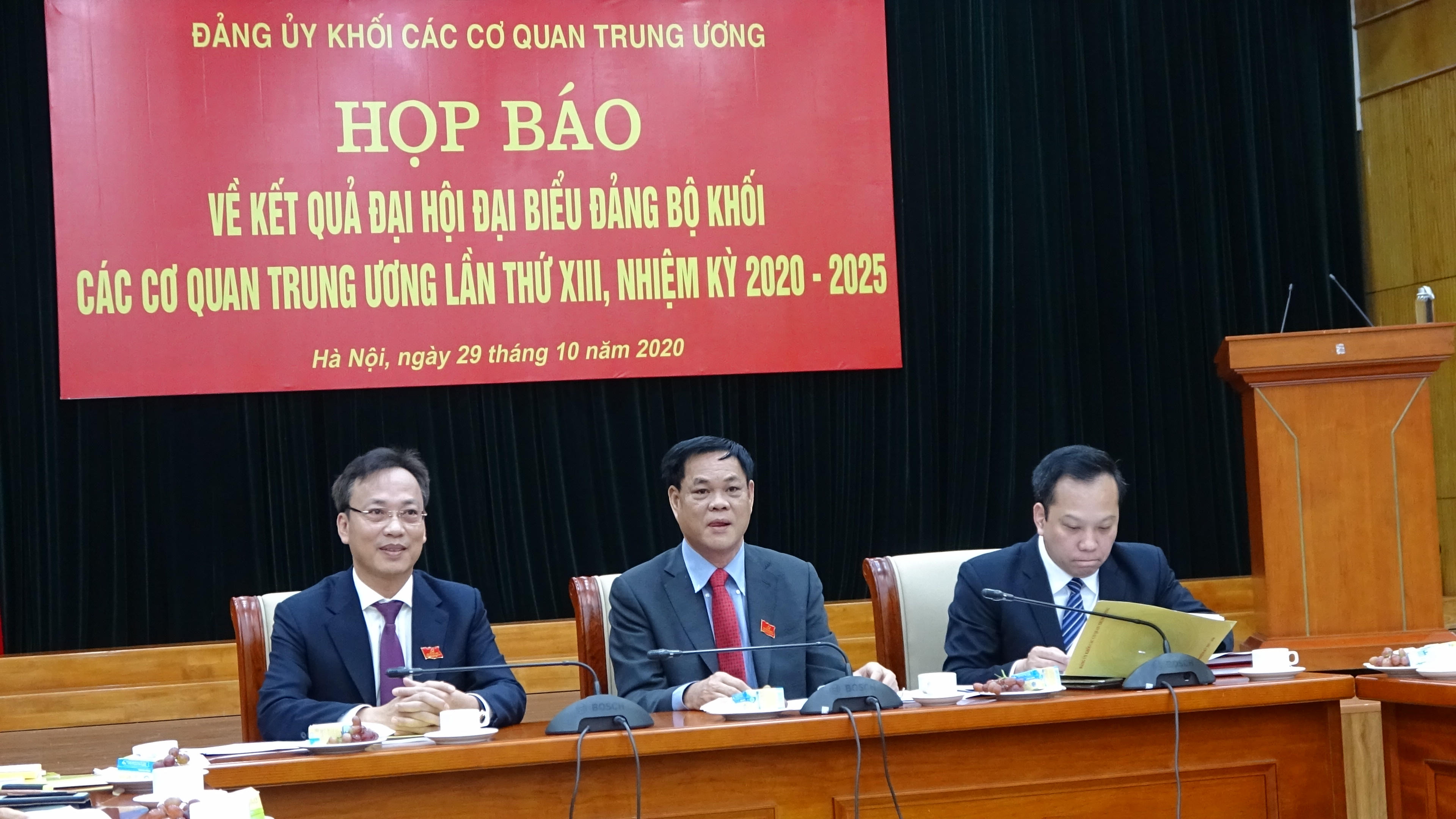 Chiều 29/10, Đảng ủy Khối các cơ quan Trung ương tổ chức Họp báo về kết quả Đại hội Đảng bộ Khối các cơ quan Trung ương lần thứ XIII, nhiệm kỳ 2020-2025. Các đồng chí: Ủy viên Trung ương Đảng, Bí thư Đảng ủy Khối các cơ quan Trung ương Huỳnh Tấn Việt; Phó Bí thư Đảng ủy Khối các cơ quan Trung ương Lại Xuân Lâm và Đỗ Việt Hà chủ trì Họp báo.