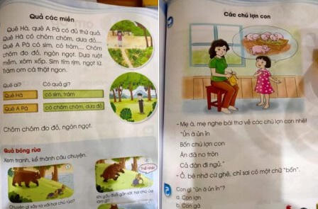 Quê Hà, Quê A Pá có đủ thứ quả. Quê Hà có chôm chôm, dưa đỏ…Quê A Pá có sim, có trám…Chôm chôm đo đỏ, ngòn ngọt. Dưa ruột mềm, xôm xốp. Sim tím rịm, ngọt lừ. Trám om cá thật ngon.  Dưa đỏ là dưa nào? Nếu là dưa hấu như hình vẽ sao không nói ngay là dưa hấu cho trẻ đỡ hình dung? Trám là loại quả ở miền núi, trẻ em lớp 1 khá xa lạ với loại quả này. Tuy nhiên, “om cá” , là việc chế biến món ăn càng khó khăn trong nhận thức với trẻ. Nhiều người lớn ở thành thị cũng chưa biết việc “om” thế nào. Chứ đừng nói đến trẻ lớp 1. Rất tiếc, người biên soạn đã làm rắc rối hóa ngôn từ, khiến trẻ em …không thể nào hiểu được. Thiết nghĩ, với trẻ lớp lớn hơn như lớp 4, hoặc 5 may ra các em mới có thể và hiểu được những từ ngữ này. (Quả các miền -trang 133)