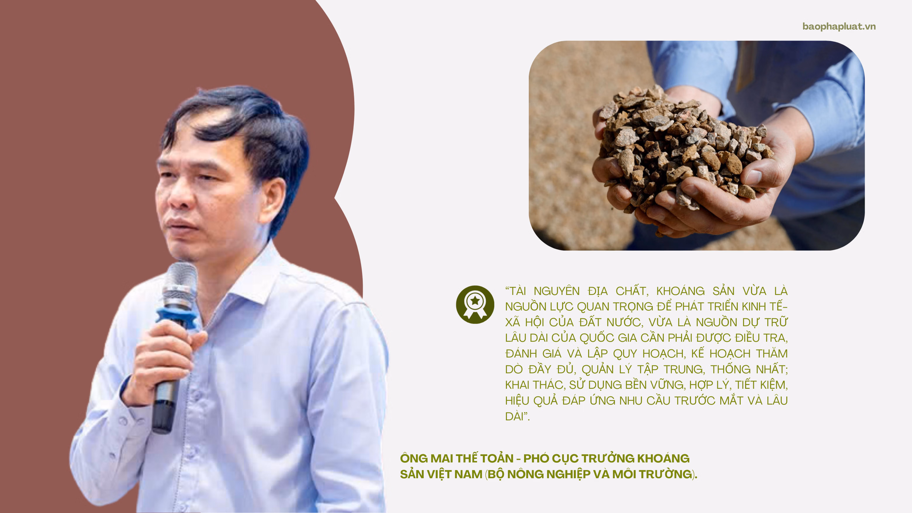 Theo Phó Cục trưởng Khoáng sản Việt Nam (Bộ Nông Nghiệp và Môi trường) Mai Thế Toản: “Tài nguyên địa chất, khoáng sản vừa là nguồn lực quan trọng để phát triển kinh tế-xã hội của đất nước, vừa là nguồn dự trữ lâu dài của quốc gia cần phải được điều tra, đánh giá và lập quy hoạch, kế hoạch thăm dò đầy đủ, quản lý tập trung, thống nhất; khai thác, sử dụng bền vững, hợp lý, tiết kiệm, hiệu quả đáp ứng nhu cầu trước mắt và lâu dài”.