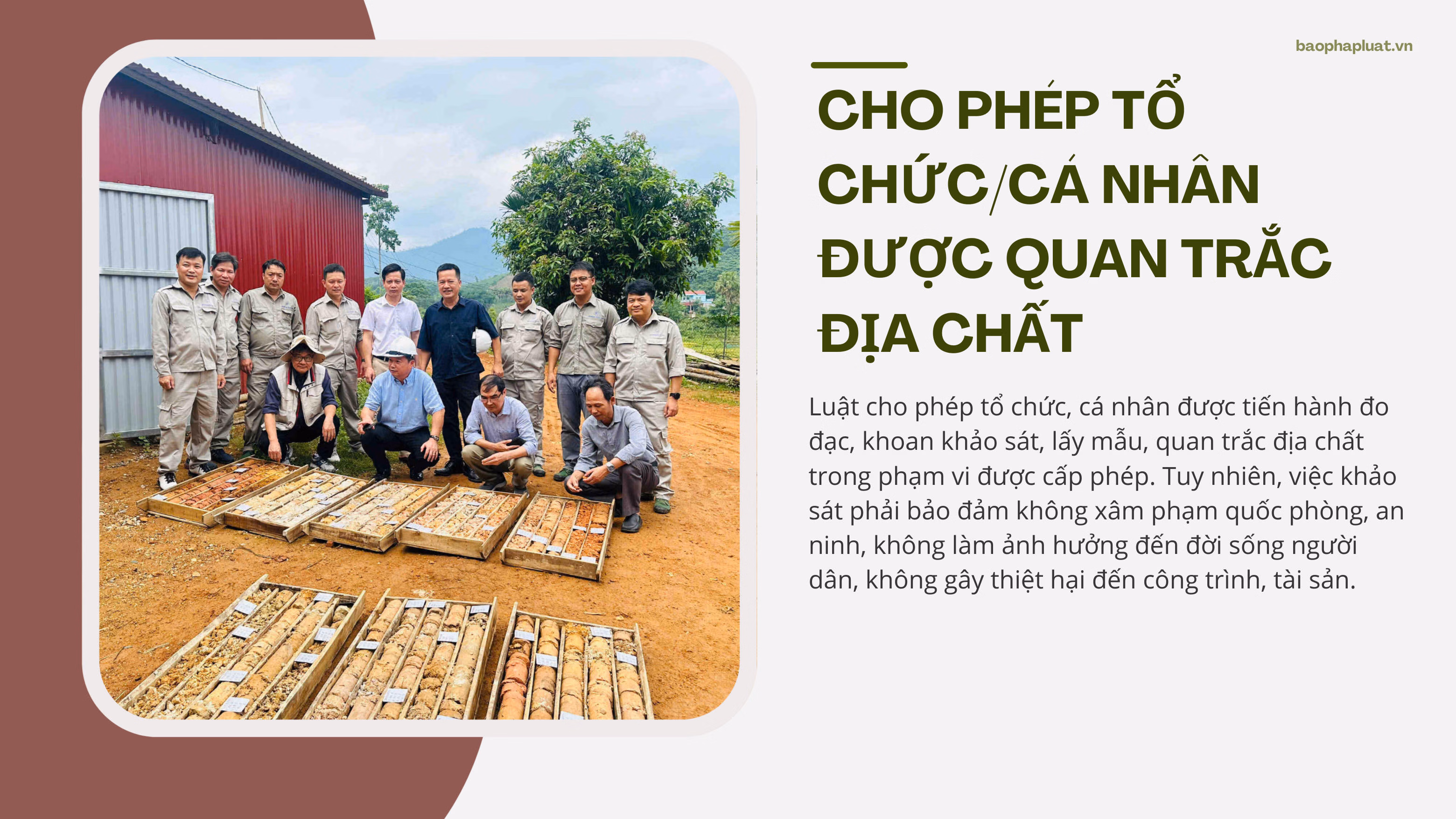 Luật cho phép tổ chức, cá nhân được tiến hành đo đạc, khoan khảo sát, lấy mẫu, quan trắc địa chất trong phạm vi được cấp phép. Tuy nhiên, việc khảo sát phải bảo đảm không xâm phạm quốc phòng, an ninh, không làm ảnh hưởng đến đời sống người dân, không gây thiệt hại đến công trình, tài sản.