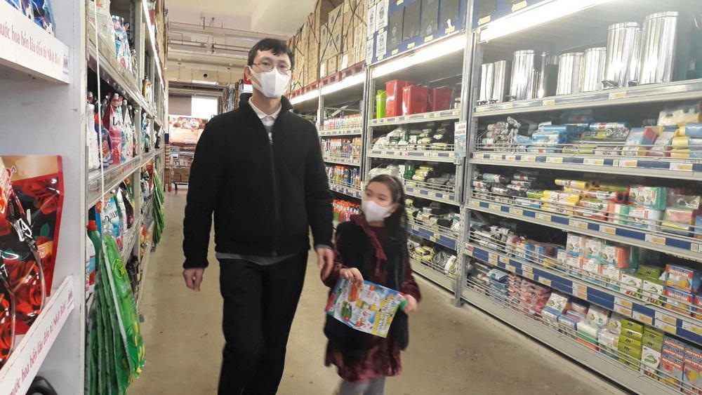 Chị Hoàng Thị Loan (Gia Thụy, quận Long Biên) lật nhẹ từng món đồ lỉnh kỉnh trên chiếc xe đẩy, đăm chiêu như tính toán. Chị chia sẻ: "Có vẻ sau Tết siêu thị chưa kịp bổ sung nhiều mặt hàng, nhất là hàng tươi sống như thịt. Tôi cùng 2 con phải tranh thủ đi nhiều nơi tìm mua những nhu yếu phẩm cần thiết. Ngoài khẩu trang còn có nước lau nhà, nước súc miệng, hay đồ khô có thể để lâu như mì tôm, miến, gạo, bánh mì, sữa tươi...".