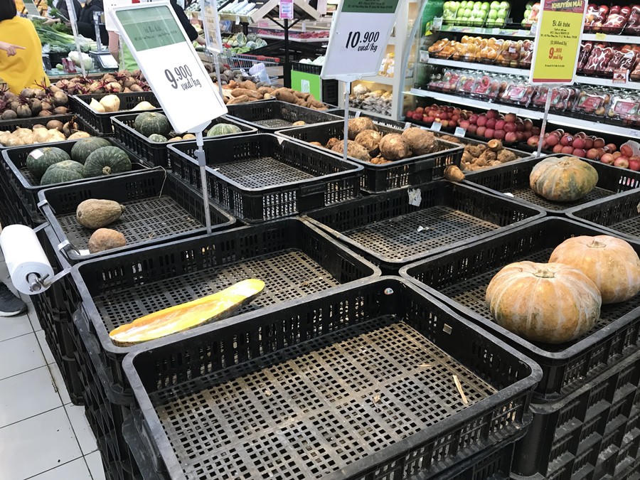 Lý giải về việc nhiều gian hàng thực phẩm, rau củ quả và thịt trống trải bất ngờ, anh Trường An (nhân viên siêu thị Vinmart) chia sẻ: "Chúng tôi vẫn cung cấp lương thực từng ngày tuy nhiên không được phong phú. Các loại rau củ trở nên hiếm hơn và đặc biệt là thịt lợn. Hiện tại giá thịt lợn đã đắt hơn giá thịt gà rồi mà vẫn không đủ số lượng cung cấp cho khách hàng. Đến cả những mặt hàng như xương ống... cũng ít hơn hẳn. Thêm vào đó, mỗi khách hàng đến siêu thị đều mua một lần rất nhiều thực phẩm dự trữ với hy vọng tích trữ thực phẩm giữa mùa dịch Corona làm cho các mặt hàng nhanh chóng hết, khiến chúng tôi trở tay không kịp".