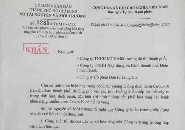 Trước đó, ngày 26/3, Sở Tài nguyên và Môi trường Thành phố Hồ Chí Minh có văn bản khẩn gửi Công ty Trách nhiệm hữu hạn Một thành viên Môi trường đô thị của thành phố, Công ty Trách nhiệm hữu hạn Xây dựng và kinh doanh nhà Điền Phúc Thành và Công ty Cổ phần Đầu tư Long Cơ về việc xây dựng báo cáo phương án hỏa táng nhằm ứng phó với tình hình của dịch COVID-19.
