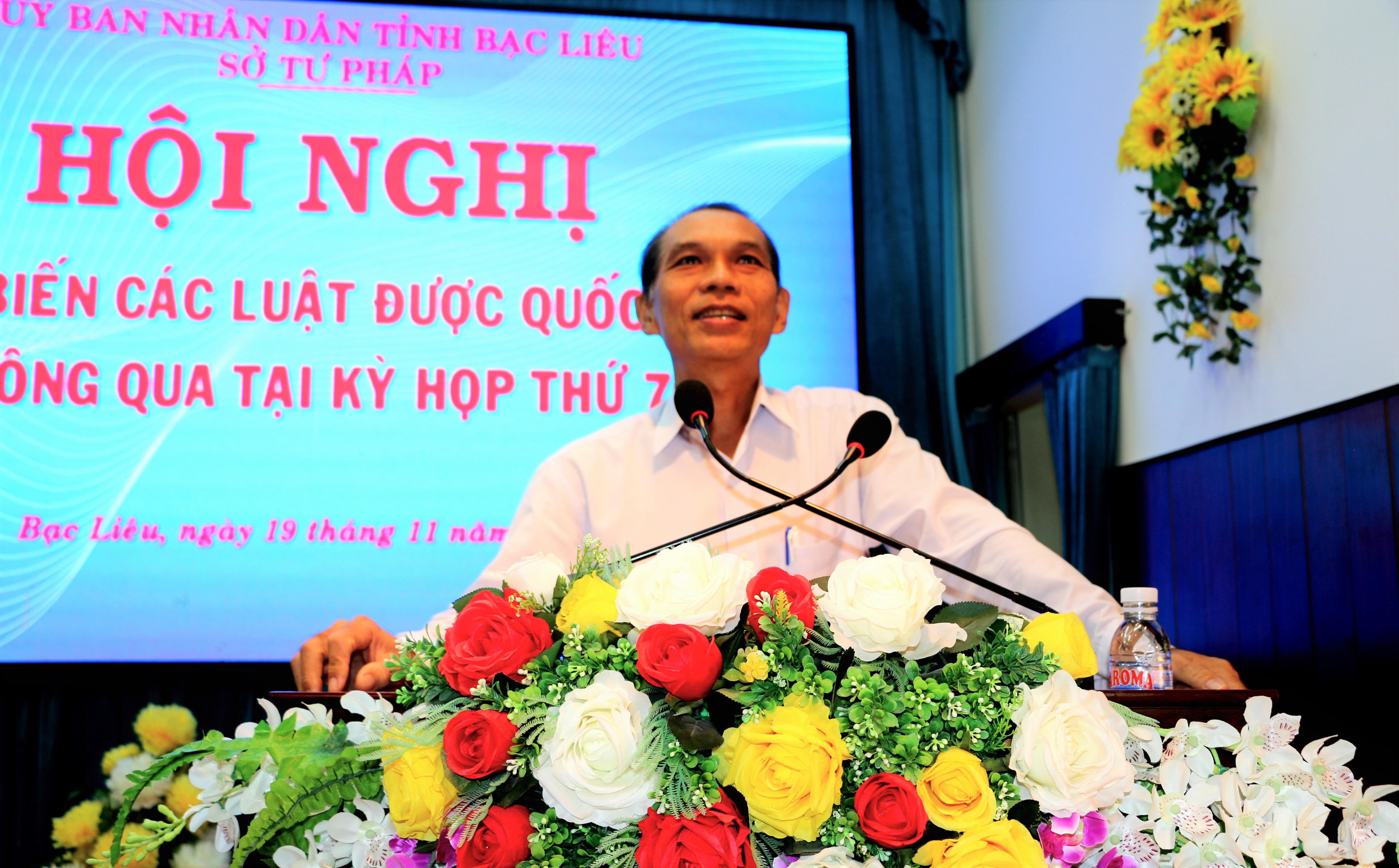 Phát biểu tại Hội nghị, ông Trần Minh Đức - Phó Giám đốc Sở Tư pháp, Phó Chủ tịch Hội đồng Phổ biến giáo dục pháp luật tỉnh Bạc Liêu nhận định: Hội nghị được tổ chức nhằm triển khai kịp thời và có hiệu quả các Luật được Quốc Hội khóa XIV thông qua tại kỳ họp thứ 7 đến các đại biểu là cán bộ chủ chốt từ tỉnh đến huyện. Đồng thời, Phó Giám đốc Sở Tư pháp cũng đề nghị các đại biểu tham dự Hội nghị nắm được những nội dung cơ bản của các luật mới từ đó triển khai thực hiện có hiệu quả và tiếp tục phỏ biến các luật đến cán bộ, công chức, viên chức, người lao động và nhân dân trên địa bàn tỉnh./.
