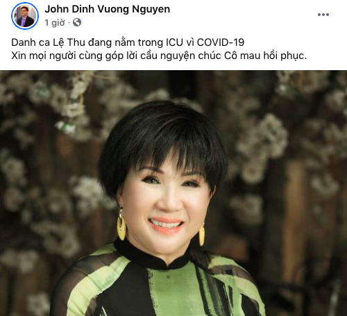 Cụ thể, anh cho biết: "Danh ca Lệ Thu đang nằm trong ICU vì Covid-19. Xin mọi người cùng góp lời cầu nguyện chúc cô mau hồi phục".