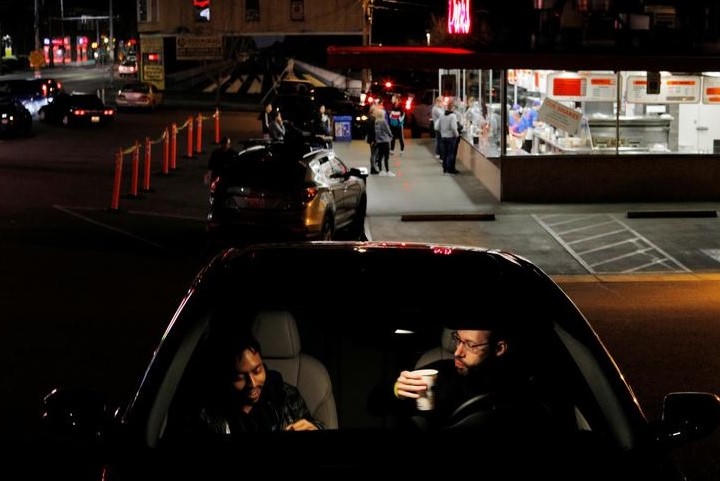Mọi người ăn tối trong xe của họ tại Dick's Drive-In vì các nhà hàng và quán bar chỉ bán đem đi và giao hàng,ở Seattle, Washington, Mỹ.