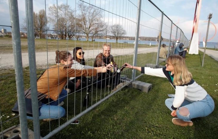 Đám bạn này cụng chai với nhau qua hàng rào do chính quyền Đức xây dựng ở biên giới Đức-Thụy Sĩ trong một công viên bên bờ hồ Constance ở Kreuzlingen.