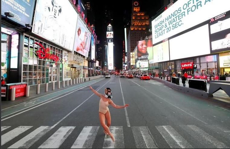 Vũ công ba lê Ashlee Montague đeo mặt nạ phòng độc trong khi cô nhảy múa tại Quảng trường Thời đại ở Manhattan (New York, Mỹ).