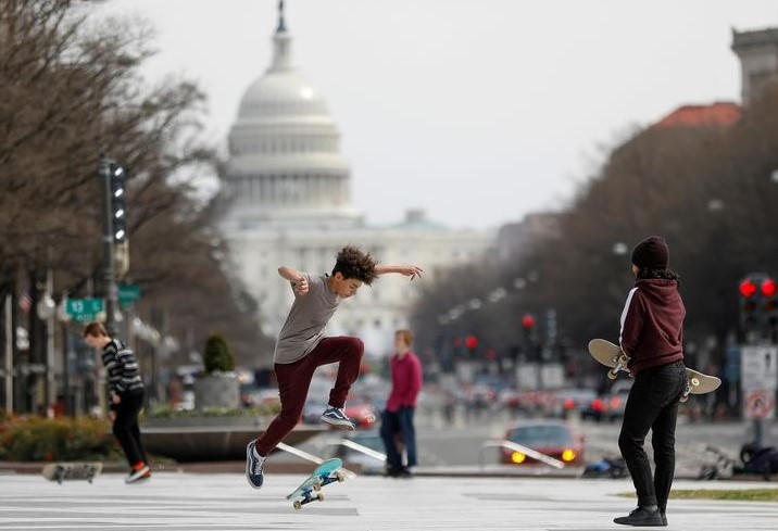 Trẻ em trượt ván tại Freedom Plaza, trong tình trạng khẩn cấp ở Washington, Mỹ.