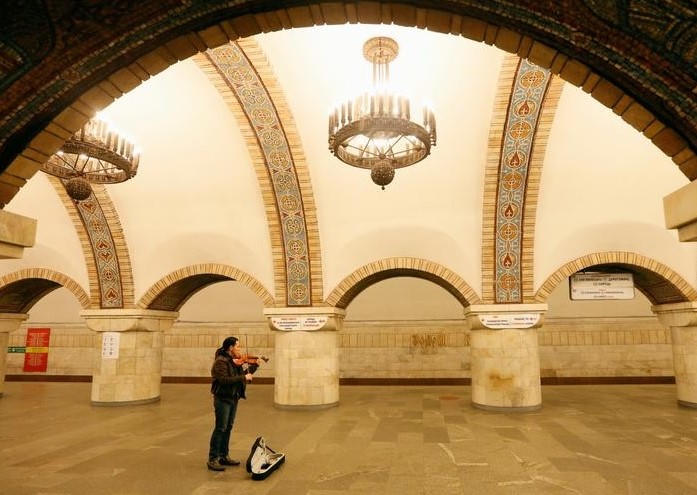Một nhạc sĩ chơi violin khi đợi chuyến tàu cuối cùng trước khi tàu điện ngầm đóng cửa do lo ngại về Covid-19, tại ga Zoloti Vorota ở trung tâm Kiev, Ukraine.
