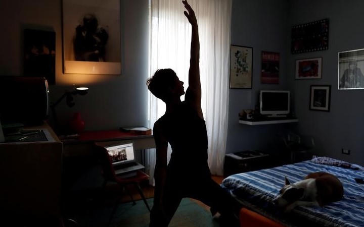 Huấn luyện viên thể dục Antonietta Orsini hướng dẫn tập thể dục cho hàng xóm của mình từ ban công của cô ở Rome, Ý.