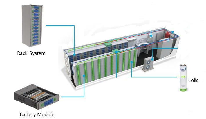 Cấu tạo của các bộ ắc quy cũng xuất phát từ các CELL có điện áp vài volt >> các CELL ghép lại với nhau thành MODULE >> các MODULE liên kết với nhau thành RACK >> và cuối cùng sẽ trở thành HỆ THỐNG (SYSTEM) tích điện.