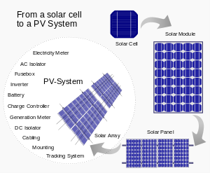 Đối với “PIN MẶT TRỜI” cũng tương tự, từ các tế bào quang điện là CELL >> liên kết với nhau thành MODULE/PANEL >> các MODULE liên kết với nhau thành ARRAY/TABLE >> và cuối cùng sẽ trở thành HỆ THỐNG (SYSTEM) năng lượng mặt trời.