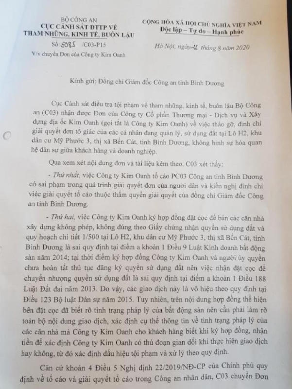 Văn bản nêu: “Qua xem xét nội dung đơn và tài liệu kèm theo, C03 xét thấy việc Cty Kim Oanh tố cáo PC03 Công an Bình Dương có sai phạm trong quá trình giải quyết đơn và kiến nghị đình chỉ việc giải quyết tố cáo, thuộc thẩm quyền của GĐ Công an Bình Dương”.
