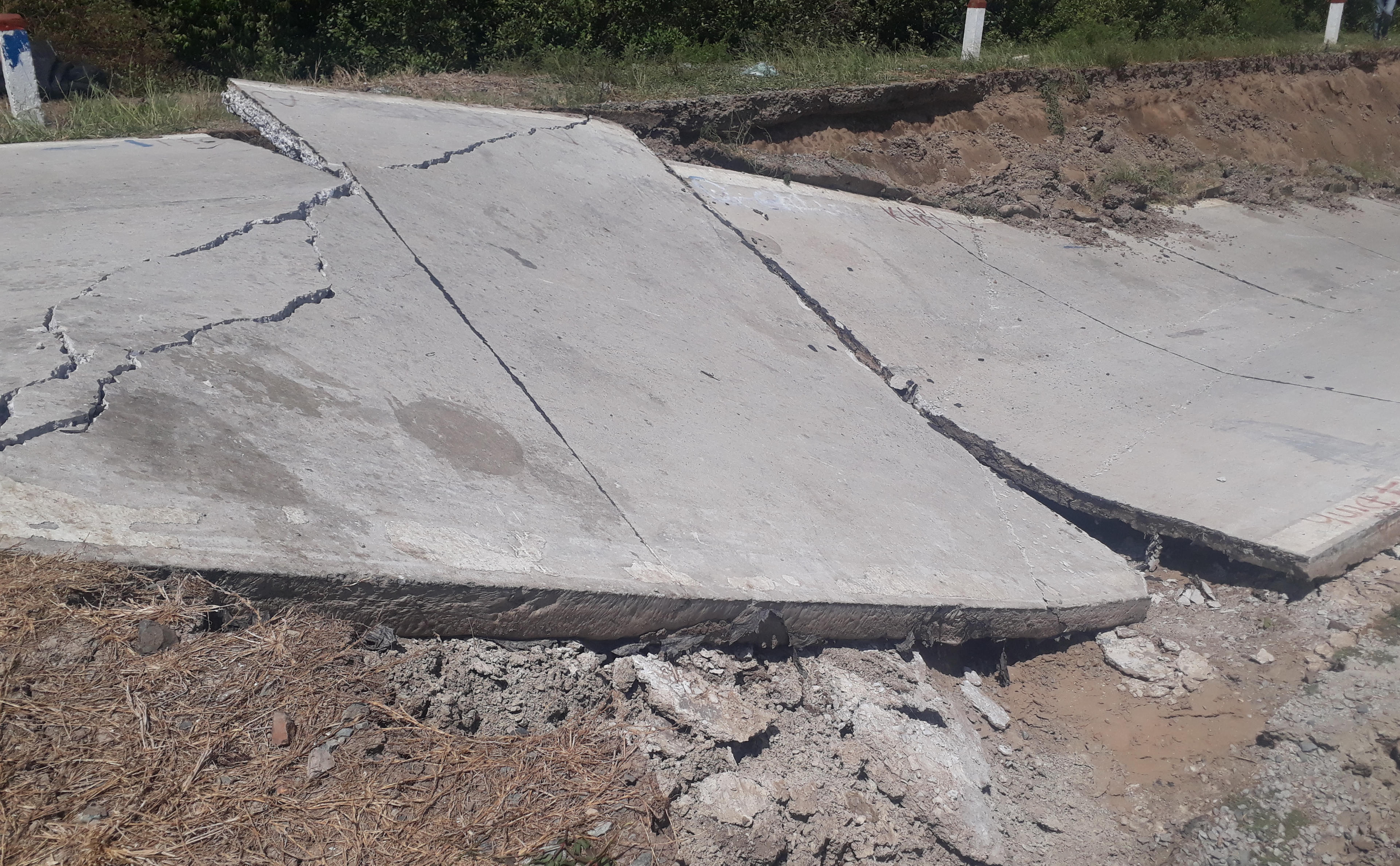 Mặt đường bê tông bị đứt gãy, chia cắt giao thông qua khu vực.