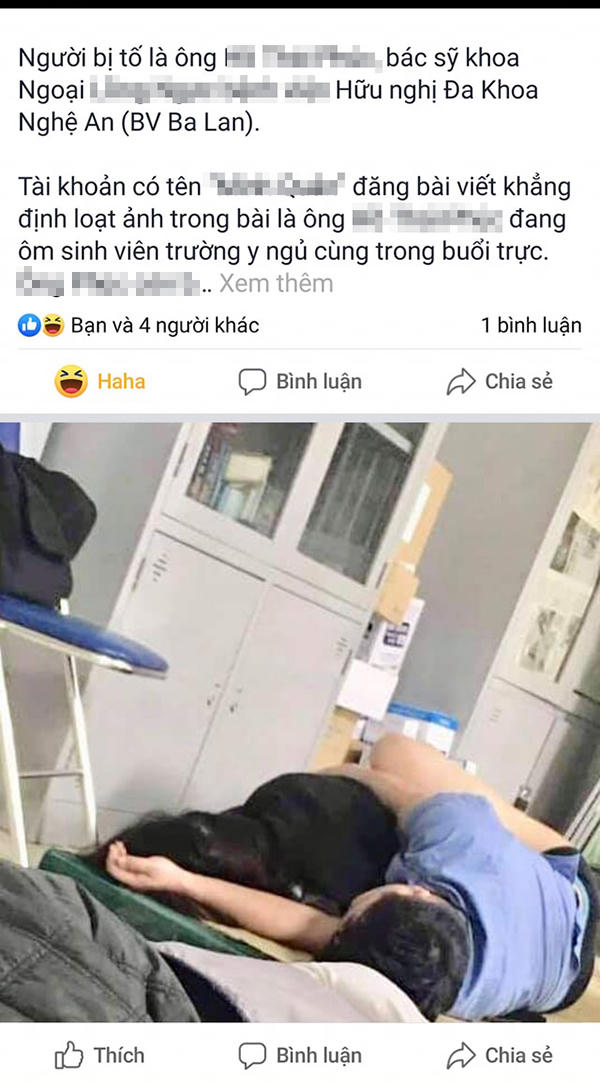 Tài khoản cũng cho rằng nam nhân vật trong ảnh là bác sỹ Khoa Ngoại tại Bệnh viện Hữu nghị Đa khoa Nghệ An, còn cô gái cạnh bên được cho là sinh viên đang thực tập tại Bệnh viện này. Giám đốc Sở Y tế Nghệ An đã có văn bản gửi Bệnh viện Hữu nghị đa khoa Nghệ An yêu cầu Giám đốc bệnh viện xác minh thông tin này để xử lý nghiêm nhân viên vi phạm theo quy định (nếu có) và báo cáo kết quả về Sở trước ngày 5/2.