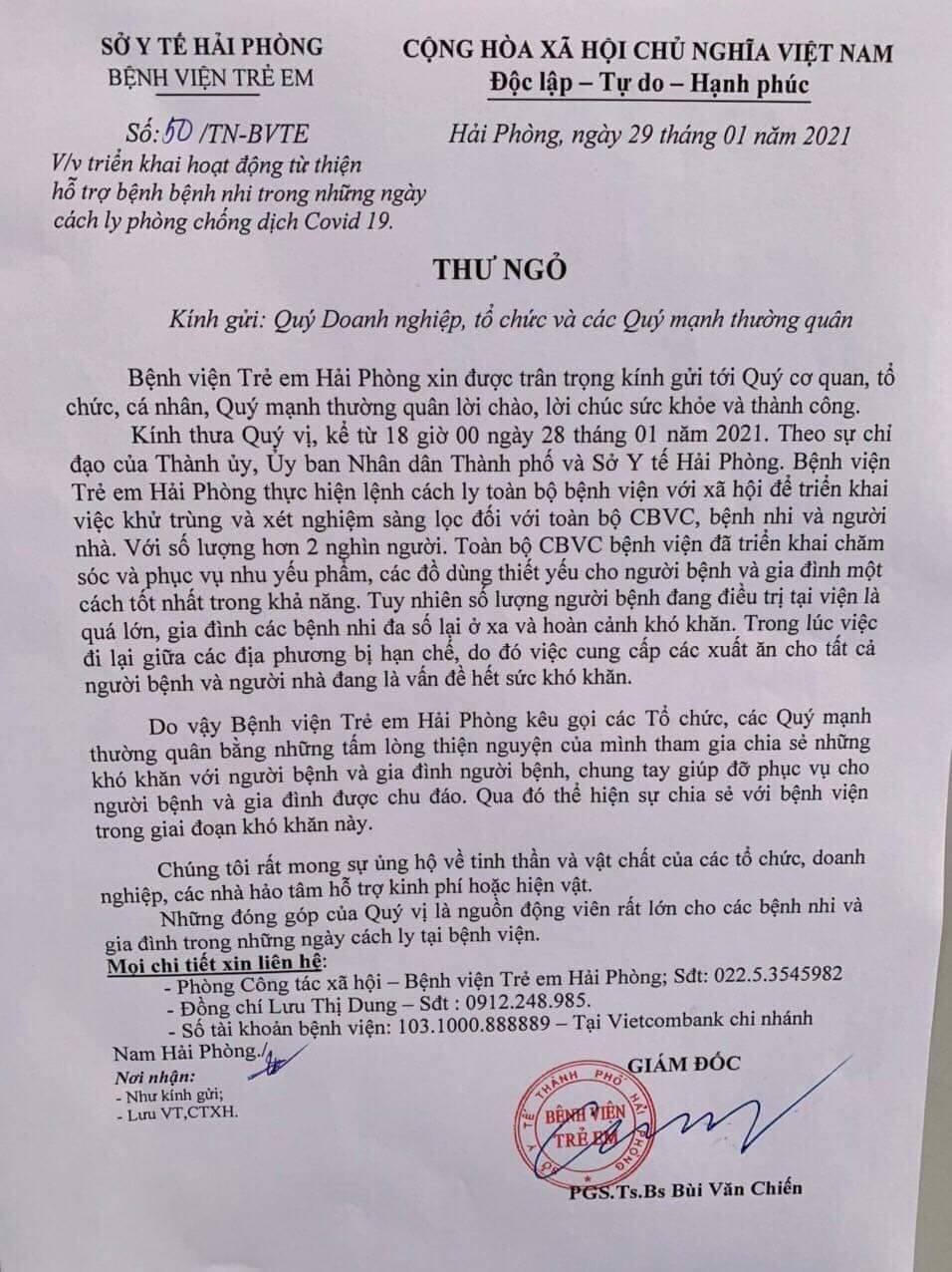 Khi phát hiện ca bệnh dương tính với Sars- CoV-2 từng đến khám tại BV Trẻ em Hải Phòng, ngay lập tức, Hải Phòng ban hành lệnh phong tỏa đối với đơn vị y tế này. Ông Bùi Quang Chiến, Giám đốc BV Trẻ em Hải Phòng đã viết “tâm thư” kêu gọi các nhà hảo tâm hỗ trợ để phục vụ hơn 2.000 người đang cách ly trong BV.