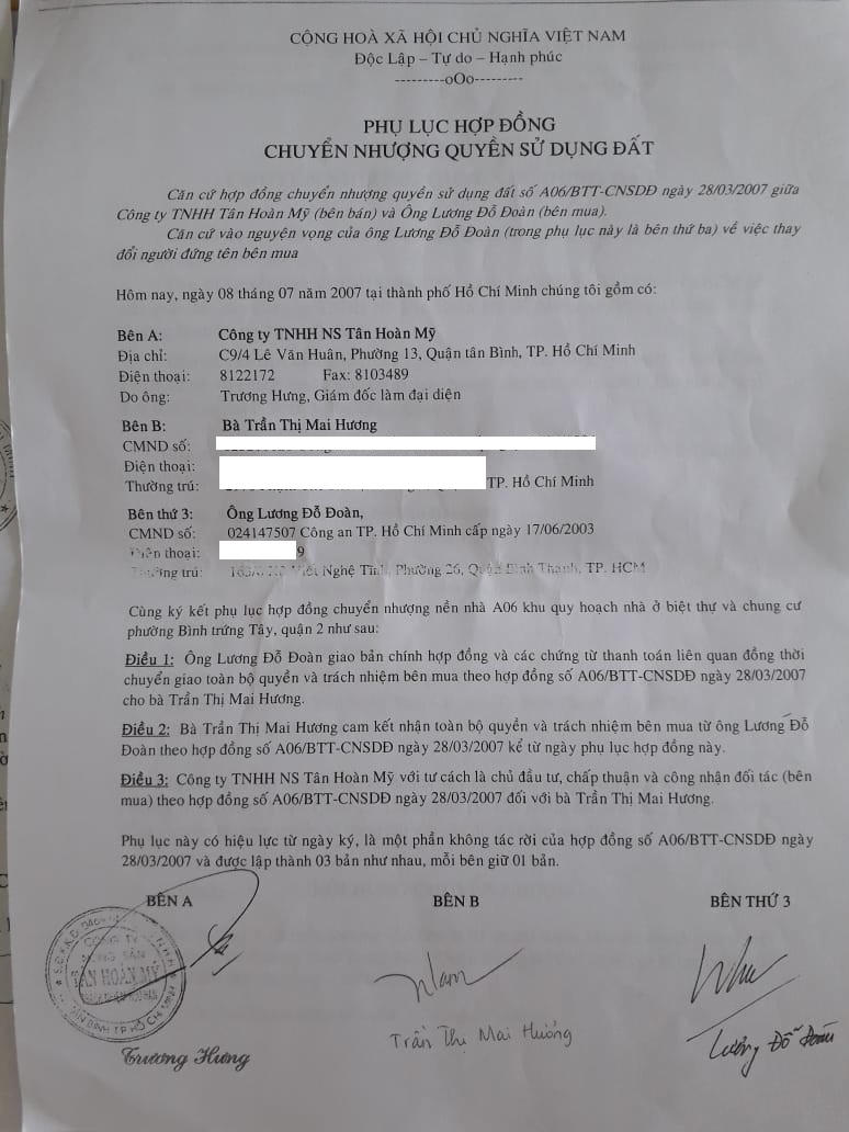 Ngày 8/7/2007, ông Đoàn ký phụ lục Hợp đồng chuyển nhượng mảnh đất trên cho bà Trần Thị Mai Hương (quận Bình Thạnh). Ông Trương Hưng, Giám đốc Tân Hoàn Mỹ ký, đóng dấu vào hợp đồng này, xác nhận ông Đoàn chuyển nhượng lô đất trên cho bà Hương.