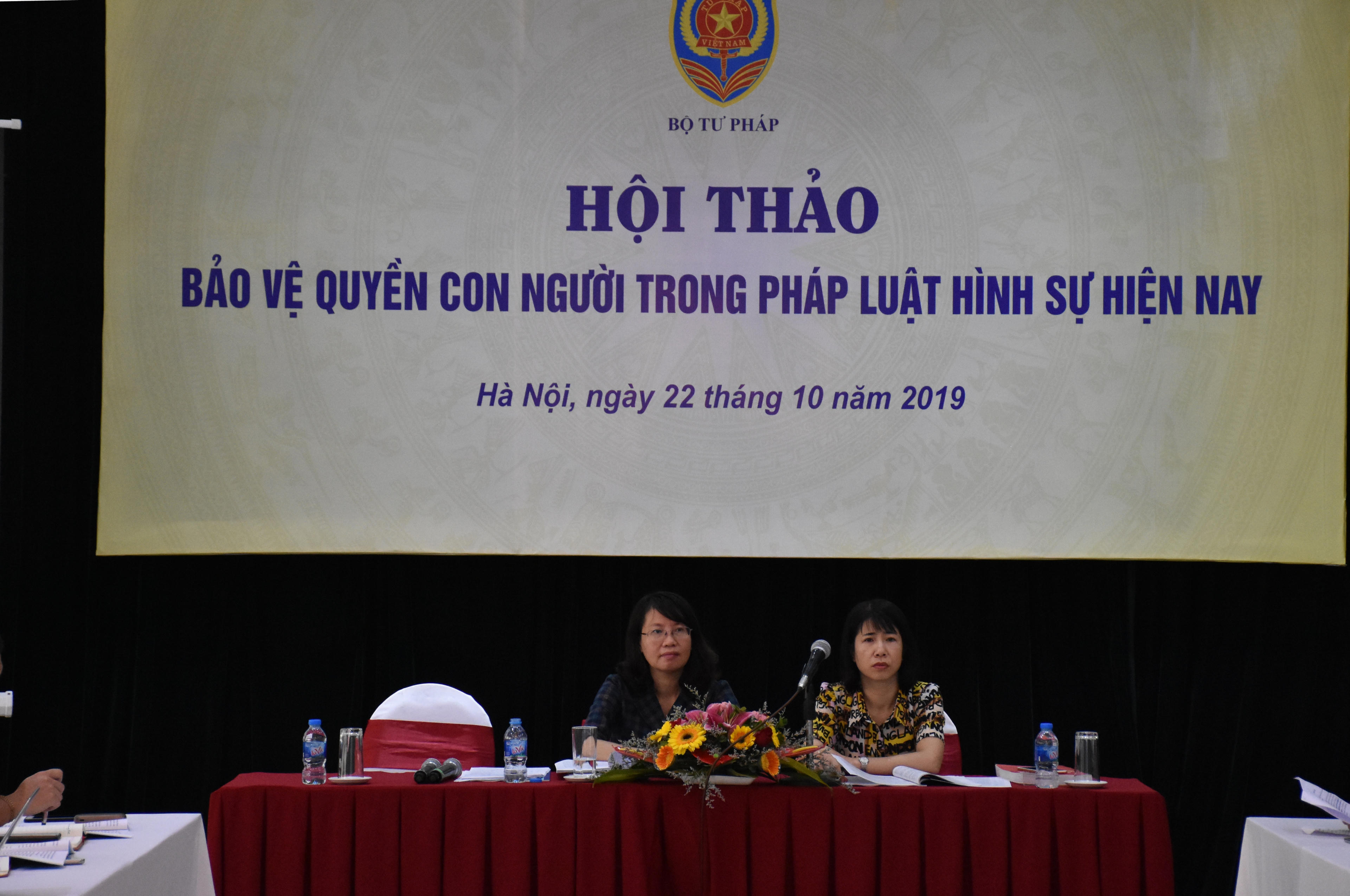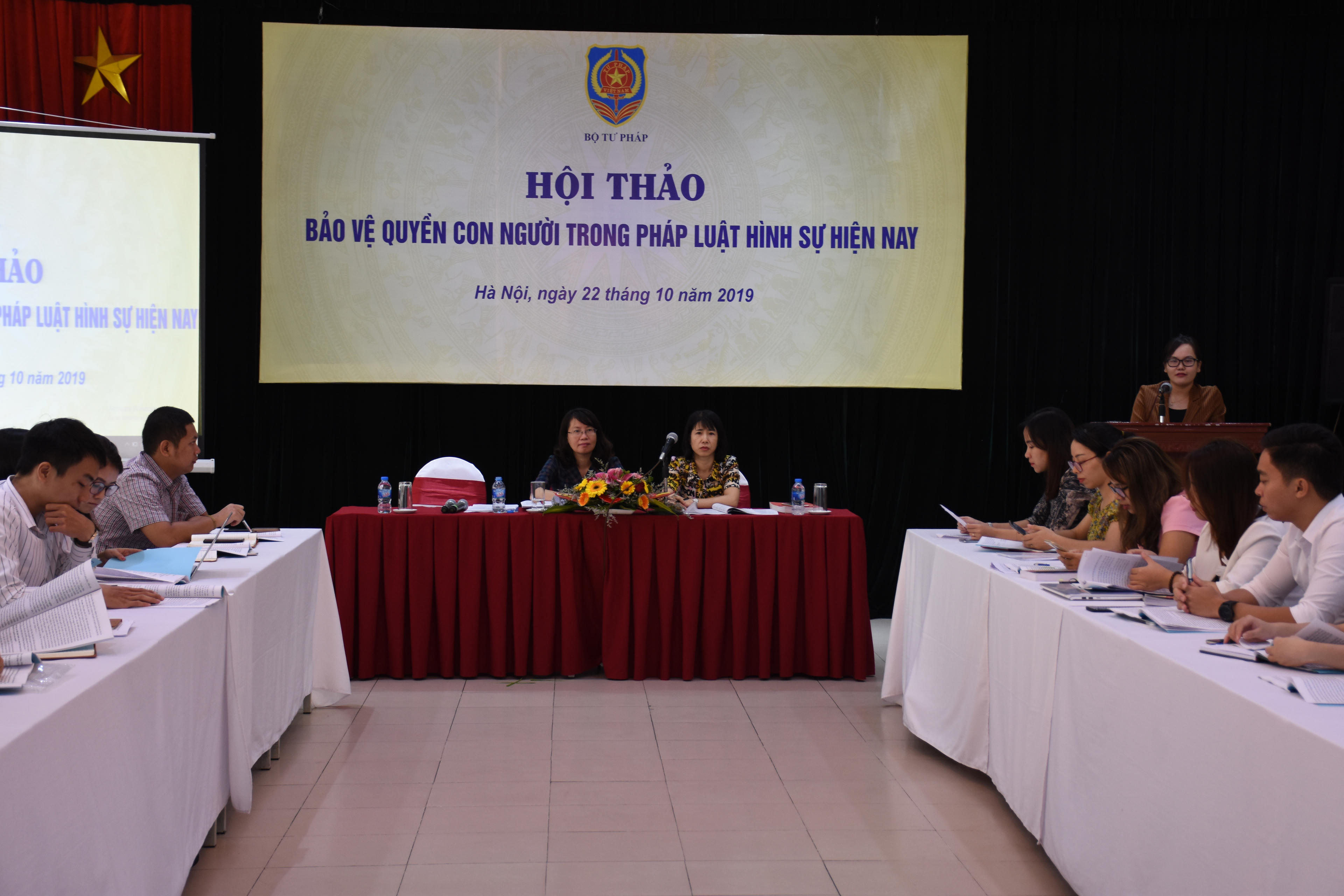 (PLVN) -Ngày 22/10, Bộ Tư pháp đã tổ chức Hội thảo “Bảo vệ quyền con người trong pháp luật hình sự hiện nay” cho công chức, viên chức trẻ có trình độ chuyên môn sâu của Bộ. Phó Vụ trưởng Vụ Tổ chức cán bộ Phan Thị Hồng Hà và Phó Vụ trưởng Vụ Pháp luật Hình sự - Hành chính Lê Thị Vân Anh chủ trì Hội thảo.