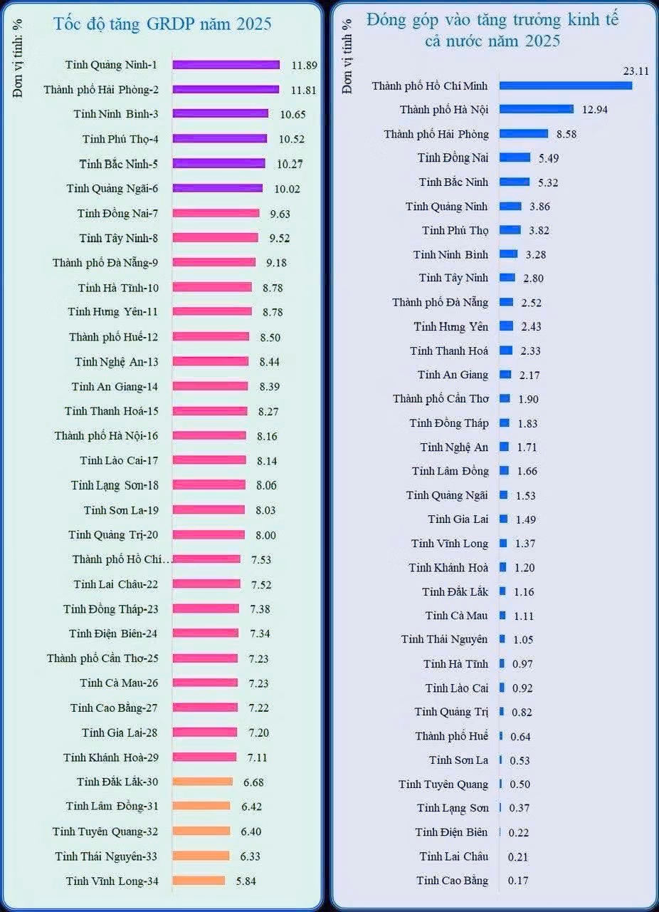Đây là dấu mốc đặc biệt khi TP duy trì đà tăng trưởng 2 con số trong suốt 11 năm liên tiếp. Sau khi sáp nhập, quy mô GRDP của TP năm 2025 theo giá hiện hành ước đạt 734.420 tỷ đồng (tương đương khoảng 29,4 tỷ USD). Tổng thu ngân sách Nhà nước trên địa bàn TP năm 2025 ước đạt 196.151 tỷ đồng, bằng 133% dự toán Trung ương giao.
