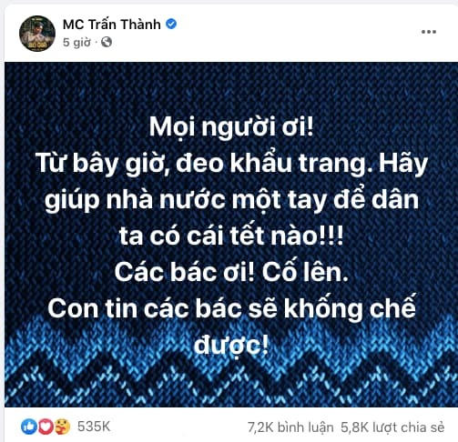 Những giờ qua, nhiều nghệ sĩ đã chia sẻ về dịch Covid-19 trên trang cá nhân của mình như: Việt Hương, Trấn Thành, Tú Vi,... Tất cả đều kêu gọi người dân giữ gìn sức khoẻ, đeo khẩu trang nơi công cộng cũng như hy vọng dịch bệnh nhanh chóng được đẩy lùi.
