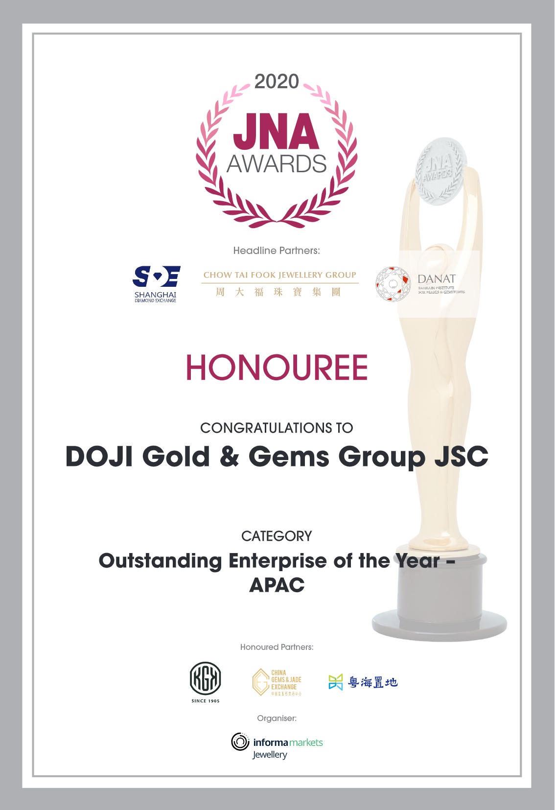 Đây là một trong những giải thưởng cao quý, có uy tín do Tạp chí Jewellery News Asia – chuyên ngành về trang sức uy tín số 1 Châu Á và có tầm ảnh hưởng trong ngành kim hoàn thế giới tổ chức.