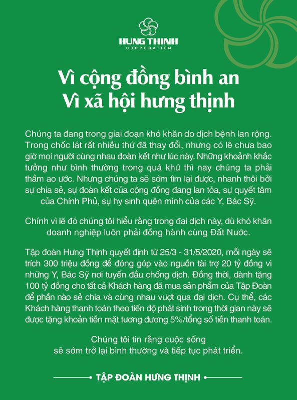 Theo đó, từ ngày 25/3 đến 31/5/2020, Tập đoàn Hưng Thịnh quyết định mỗi ngày sẽ trích 300 triệu đồng để đóng góp vào nguồn tài trợ 20 tỷ đồng vì những Y, Bác sĩ nơi tuyến đầu chống dịch. Đồng thời, dành tặng 100 tỷ đồng cho tất cả Khách hàng đã mua sản phẩm của Tập đoàn để phần nào sẻ chia và cùng nhau vượt qua đại dịch.