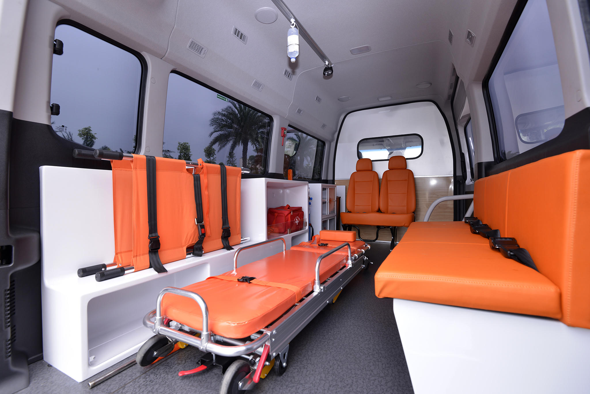 Mẫu xe cứu thương được trang bị thêm các thiết bị y tế chuyên dụng như bình oxi, móc treo dịch truyền, tủ đồ, ổ cắm điện chuyên dụng, hệ thống phát tín hiệu ưu tiên... Sở hữu kích cỡ lớn, xe được trang bị cáng và túi cứu thương tiêu chuẩn, hệ thống dây điện chống cháy an toàn sẵn sàng lắp đặt thêm các trang bị y tế chuyên dụng hiện đại khác.