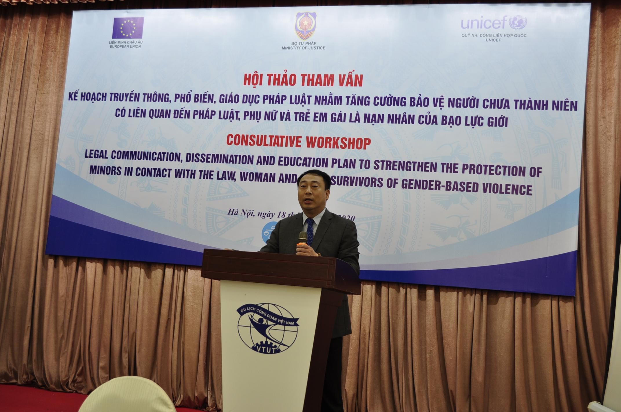 (PLVN) -Sáng 18/6, dưới sự tài trợ của UNICEF và UNDP, Bộ Tư pháp đã tổ chức Hội thảo tham vấn hoàn thiện dự thảo Kế hoạch truyền thông, phổ biến, giáo dục pháp luật (PBGDPL) nhằm tăng cường bảo vệ phụ nữ và trẻ em; phòng, chống bạo lực giới (BLG).
