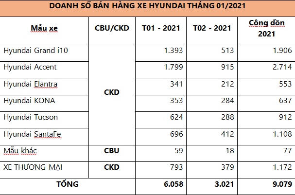 Doanh số bán hàng các mẫu xe Hyundai trong tháng 02/2021 (Đơn vị: Xe)