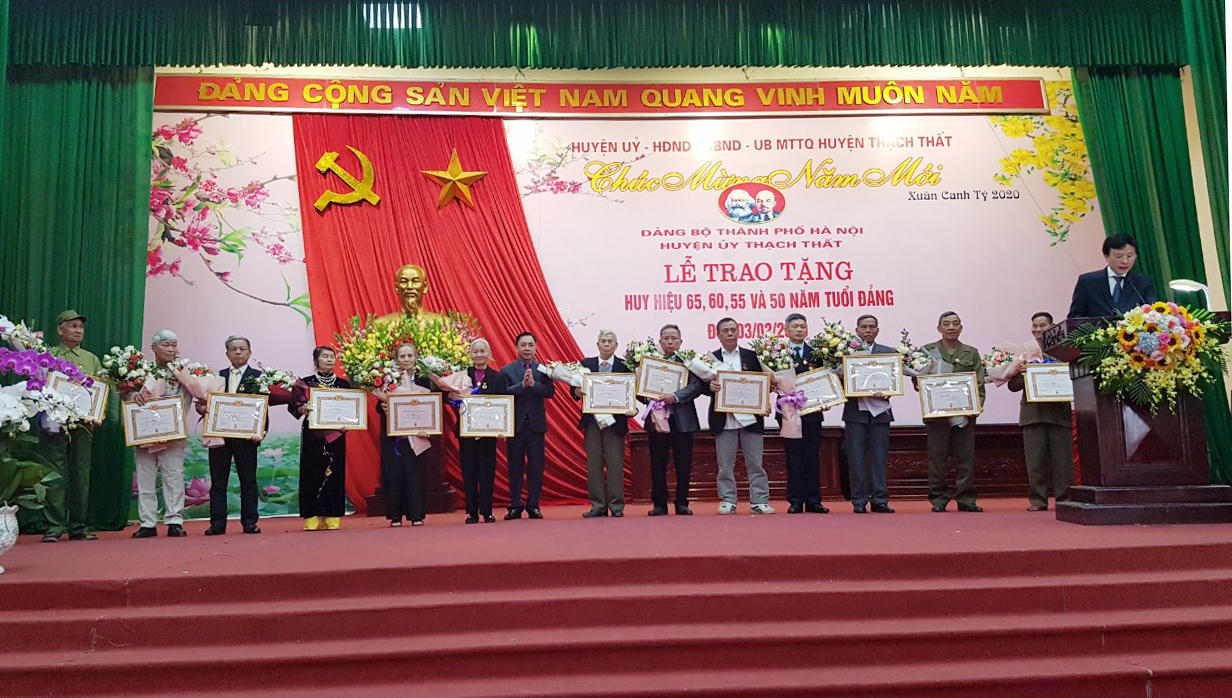 Theo Quyết định số 8301-QĐ/TU của Thành Ủy Hà Nội, Ban thường vu thành ủy quyết định tặng Huy hiệu cao quý của Đảng cho 121 Đảng viên cao tuổi thuộc Đảng bộ huyện Thạch Thất. Trong đó có 1 đảng viên được nhận Huy hiệu 65 năm tuổi Đảng, 15 đảng viên được nhận Huy hiệu 60 năm tuổi Đảng; 12 đảng viên được nhận Huy hiệu 55 năm tuổi Đảng, 13 đảng viên được nhận Huy hiệu 50 năm tuổi Đảng, số còn lại là huy chương 45, 40, 30 năm tuổi Đảng.