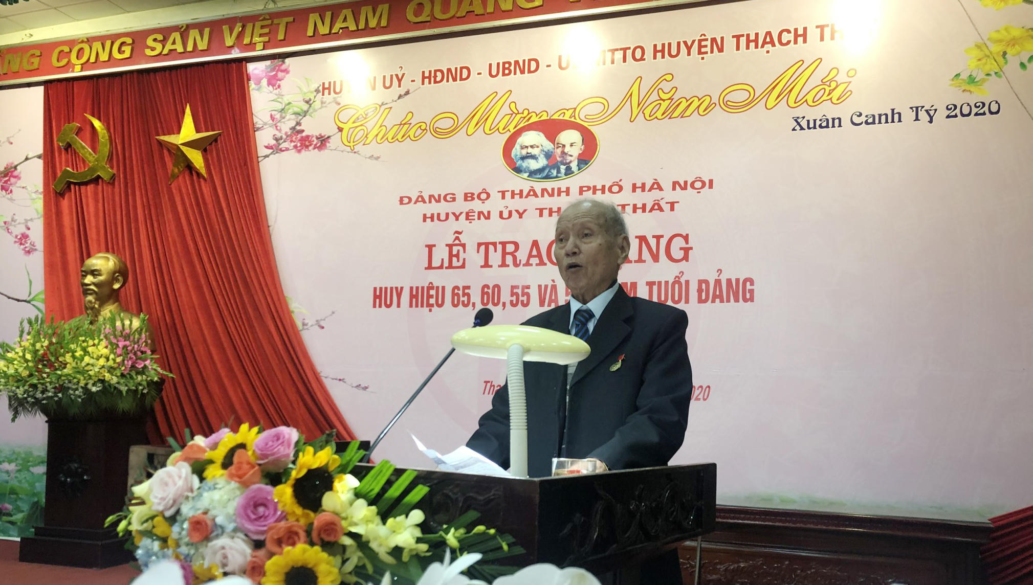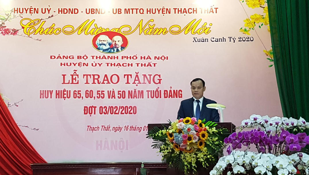 Thay mặt lãnh đạo và nhân dân Thạch Thất, ông Nhật cảm ơn những công lao đóng góp của các đồng chí đảng viên cao tuổi được nhận huy hiệu hôm nay.