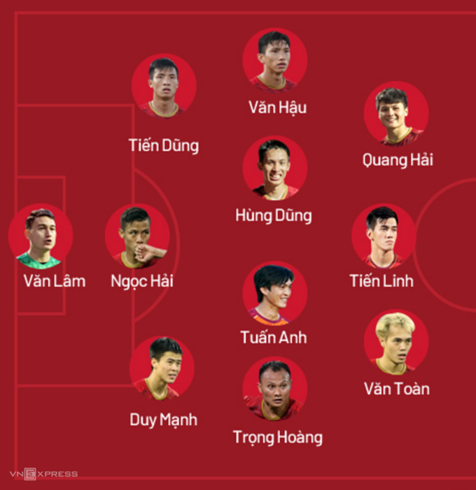 Văn Lâm, Quế Ngọc Hải, Duy Mạnh, Tiến Dũng, Trọng Hoàng, Văn Hậu, Tuấn Anh, Hùng Dũng, Quang Hải, Văn Toàn, Tiến Linh.