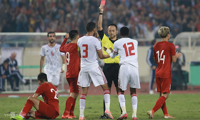 5' Tốc độ của trận đấu được đẩy lên cao ngay sau tiếng còi khai cuộc. Trọng tài vừa nhắc nhở Văn Hậu sau pha phạm lỗi với cầu thủ UAE.