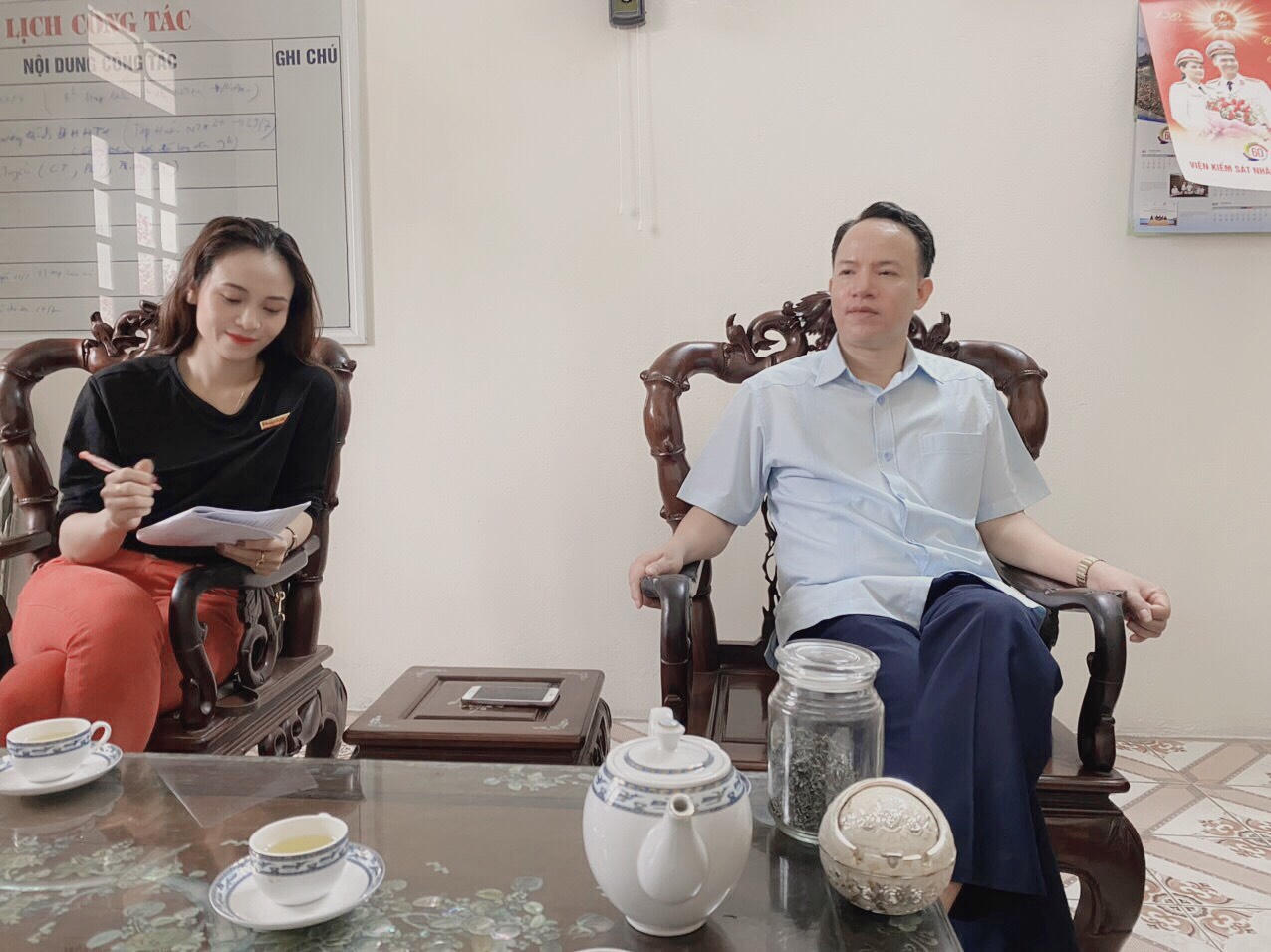Ông Bùi Văn Triều, Chủ tịch UBND xã Hương Sơn trao đổi với phóng viên